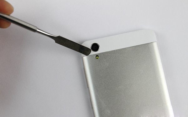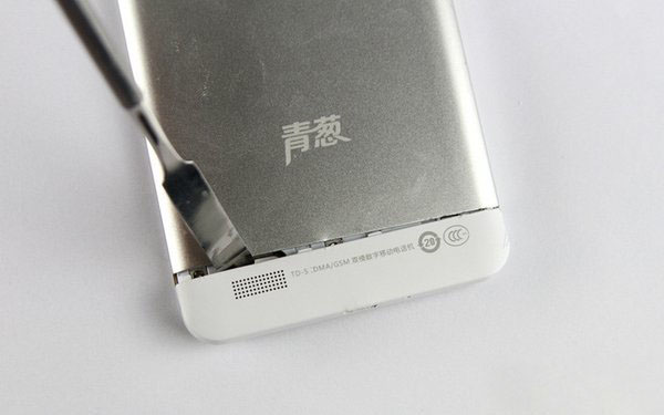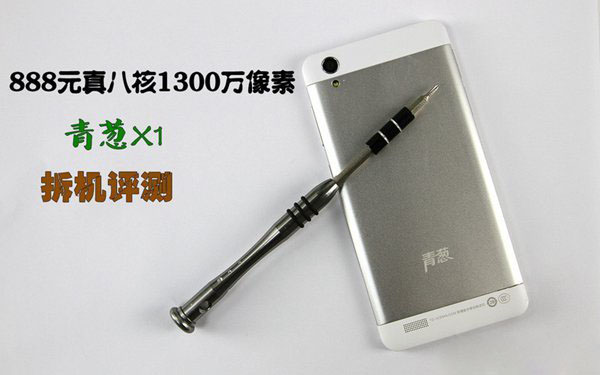 拆机前先简单看看这款手机的配置情况,青葱X1采用了5英寸720P全贴合IPS高清屏,搭载了1.7Ghz联科发MT6592真八核处理器,运行1G内存以及16G存储空间,拥有前置800万/后置1300万像素摄像头,内置1900mAh容量电池,支持移动3G+GSM双卡双待,基于安卓系统,售价888元,就综合配置而言,该机已经超越酷派大神F1了。