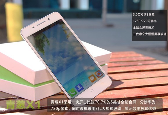 正面方面,青葱X1采用了块屏占比达70.7%的5英寸全贴合720P高清屏幕,并且采用的是三代大猩猩玻璃,显示效果非常出色。
