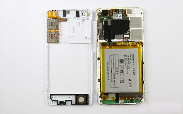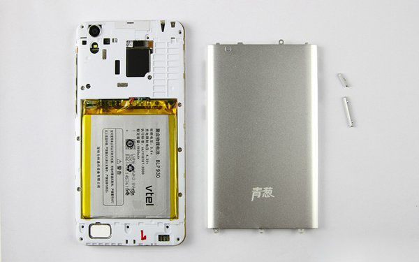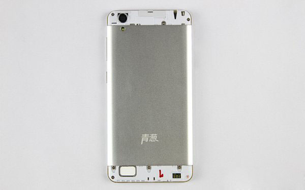 将后壳全部拆除后,我们就可以看到青葱X1手机的内部结构了,如下图所示: