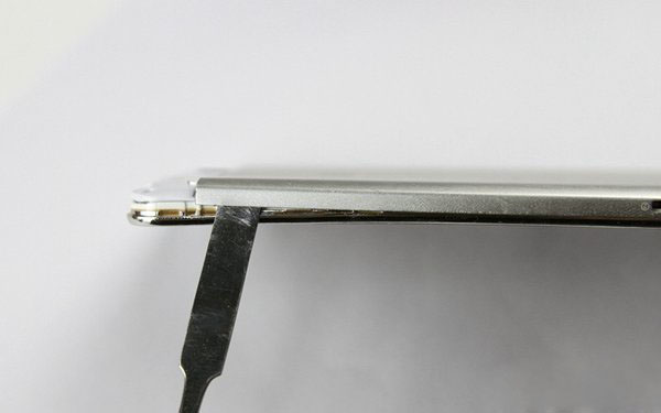 拆除固定螺丝,用撬棒沿边框处的缝隙,分离金属背壳,力度一定要轻,不然金属背壳很容易变形,如下图所示。
