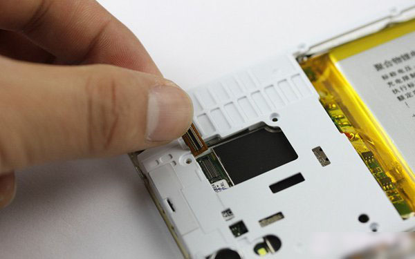 再接下来的是断开屏幕排线、按键排线和屏幕触控排线,如下图所示: