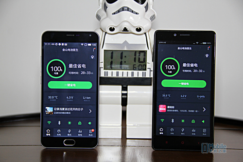 我们跳过1280x720像素(红米Note)和1920x1080像素(魅蓝note2)的屏幕对比,这并不像1080像2K过渡那样的不令人察觉,因为两者在根本上有质的差异,尽管MIUI V6有做优化,但图标和文字的锯齿感依然感动天感动地。所以我们直接进入这个价格段更令消费者关心的问题,续航。