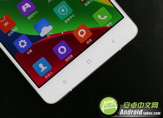 小米Note的屏幕下方是标准的三颗小米手机功能按键,从左至右依次为多任务键(长按为菜单键)、主页键、返回键。按键带有白色背光,方便人们在光线不足的情况下清楚的识别按键位置。