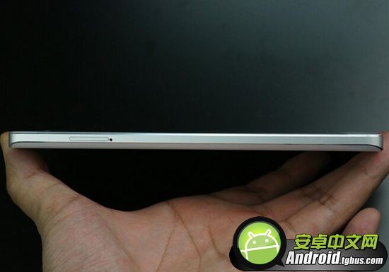 该机的边框采用金属材质磨砂处理以及倒角工艺,与小米4类似,但整机厚度就和小米4相差悬殊了,仅为6.95mm,最薄处仅为4.1mm,所以边框略显尖锐。而小米4厚度为8.9mm,拿在手中更加贴合,比小米Note感觉要好一些。