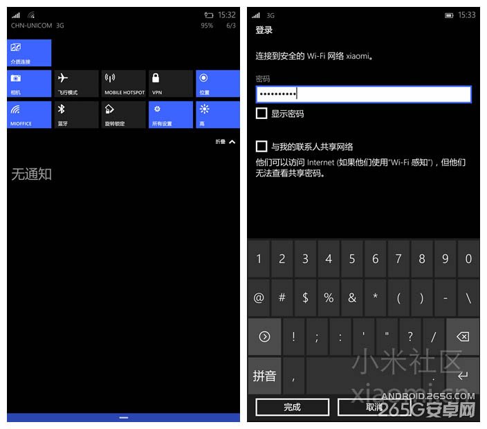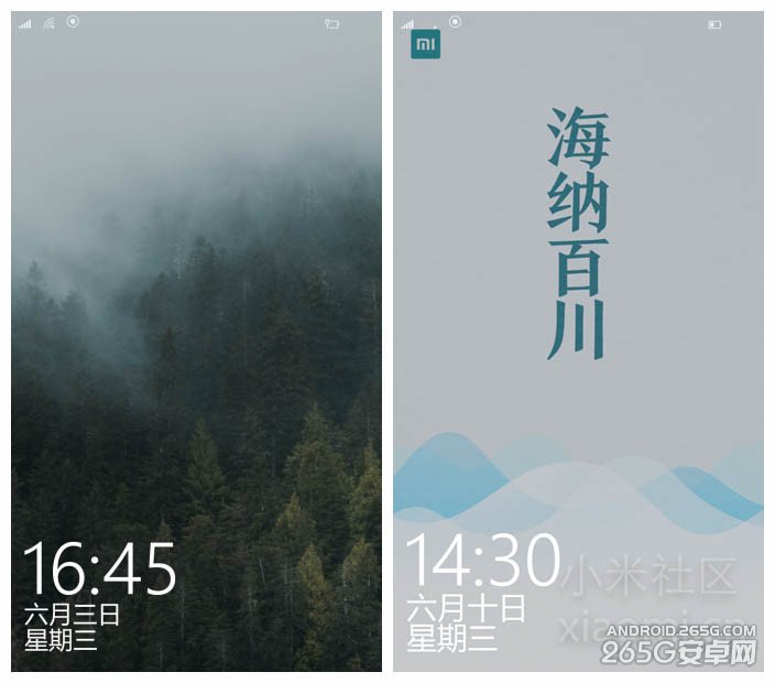 Win10 版小米4的锁屏界面可以直观的看到浸透式状态栏,左下方显示当前的时间、日期和星期。锁屏壁纸可以在设置中在线选择,也可以导入本地精彩美图(左下方是 Bing推荐的世界各地美景,右下方则是小米沟通会的海报图)。在锁屏界面不设密码的情况下只可进行两项操作,在屏幕上方下拉显示通知中心;上划进行解锁屏幕,进入系统桌面。
