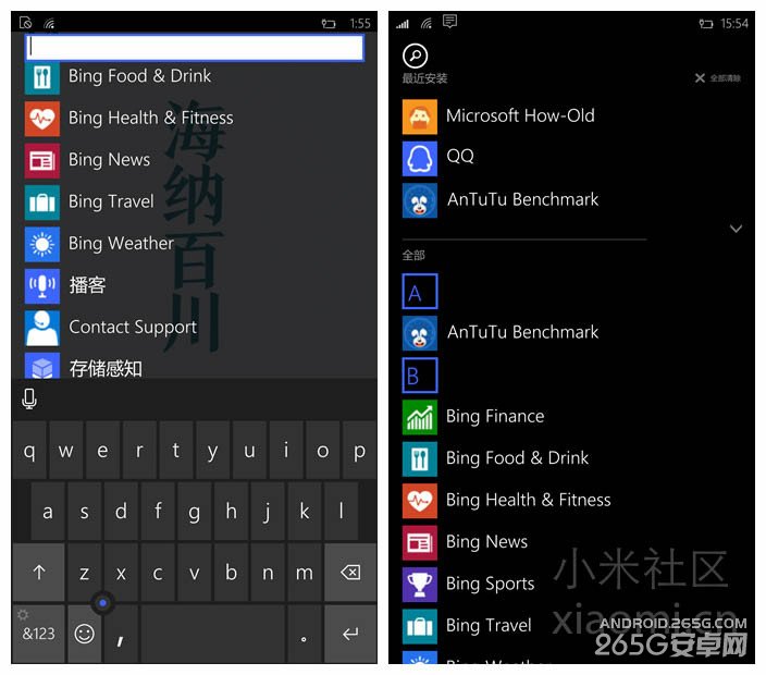 在系统桌面状态下左划即可进入应用列表页,Win10版小米4的应用列表默认是按应用首字母排序的,在这里你可以找到系统内置以及近期安装过的所有APP。
