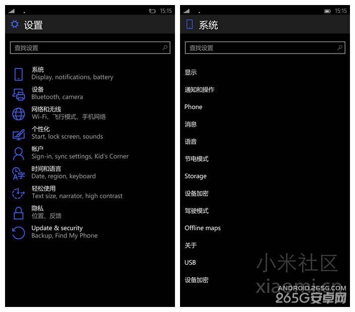 在应用列表里可以快速选择进入手机设置,初次体验Win10版小米4的设置,接下来为大家列举几个在设置中发现的亮点。