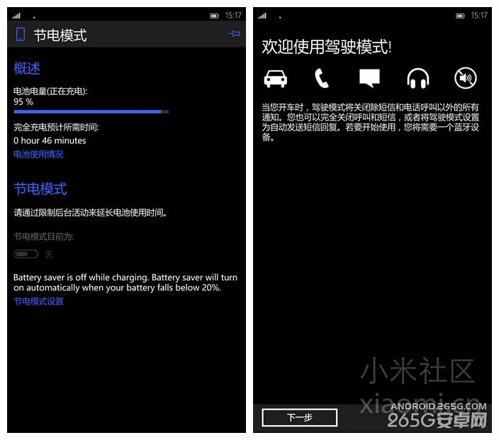 Win10 版小米4的系统也内置了节电模式,可以设置当电量低于百分之多少时自动开启节电模式,从而延长手机剩余电量的使用时间。Win10版小米4的驾驶模式也是非常赞的,你可以预先设置好驾驶时需要拦截的功能(电话/短信),也可以设置当有蓝牙设备(可预设某一个蓝牙设备)接入时自动启动驾驶模式。