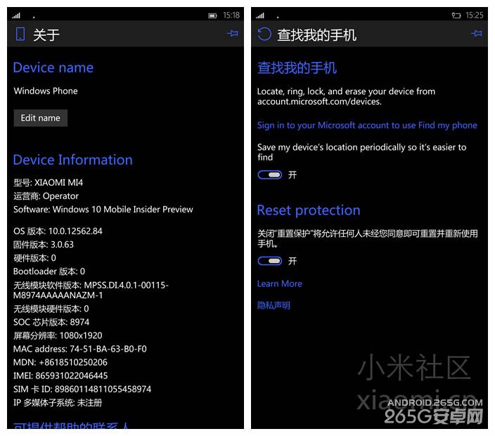 还在担心手机丢了找不到?Win10版小米4中也内置了查找手机的功能,当然查找你的手机得保持联网并且是已登录微软账号的状态。在这里开启重置保护后可以防止系统被恢复,有效保护了手机中的重要信息不被外泄。