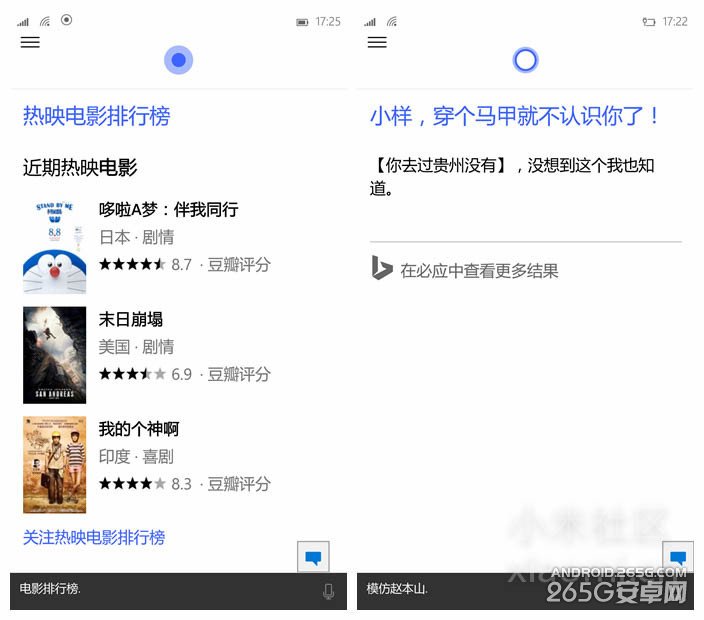 你还可以查看近期的电影排行榜、让她模仿赵本山!据微软相关负责人透露,小娜很快将会实现跨平台,未来可通过App Store、Google Play商店进行下载哦!