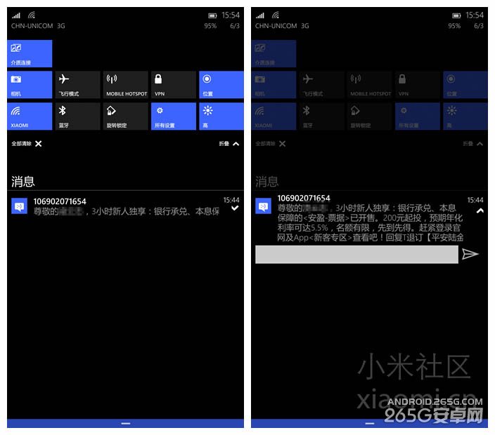 Win10版小米4的通知栏可以在任何界面通过下拉屏幕打开,全屏状态下可以看到更多的快捷设置以及通知内容。同样的,轻点图标进行某项功能的开关,长按某个设置可以进入详细的设置界面,非常方便。