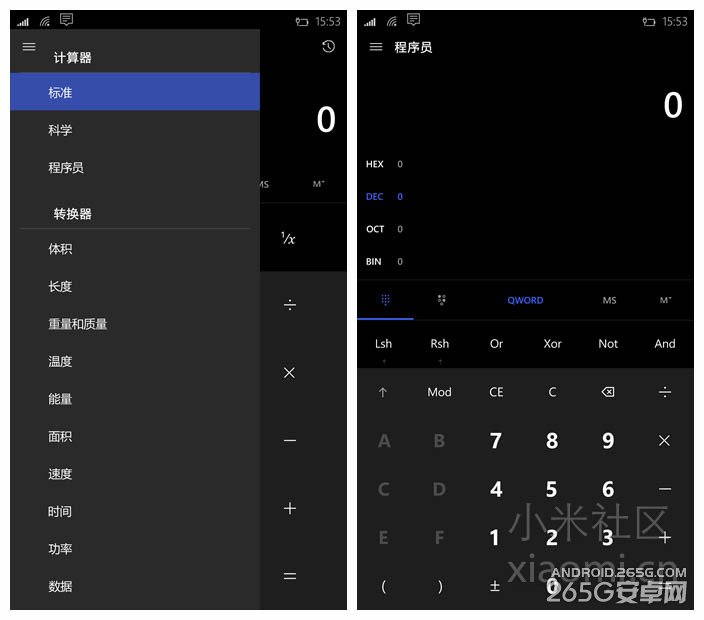 由PC导入手机的计算器同样具有和PC版的三种模式—标准、科学和程序员模式,内置转换器具有相同的列表。对于日常使用Windows系统PC的小伙伴来说这是个非常棒的消息。