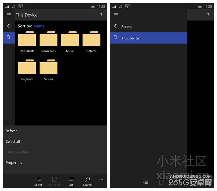 Win10版小米4中的文件管理支持批量操作文件,复制/粘贴,搜索,查看近期文件,查看文件属性等常用操作。