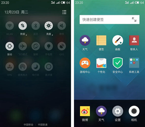 Flyme 4.1的壁纸采用了毛玻璃壁纸,看起来很时尚具有美感。下此外,Flyme 4.1也拥有常见的上拉菜单快捷操作和后台管理操作,一些常用的设置开关均位于顶部的下拉菜单中,底部还有后台管理便携菜单,操作上非常方便,如下图所示。