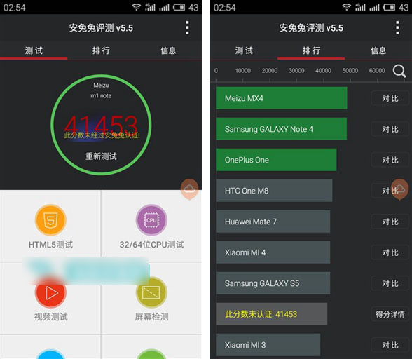 就跑分性能来说,魅蓝Note安兔兔跑分超过4万分,已经接近高端旗舰机的跑分水准了,相比搭载64位高通615八核处理器的智能手机,跑分更高,就跑分控而言,这无疑令人兴奋。对于玩大型的手机网络游戏以及看高清的视频依然很流畅,足以满足我们的日常需求。
