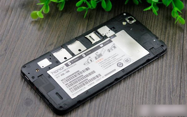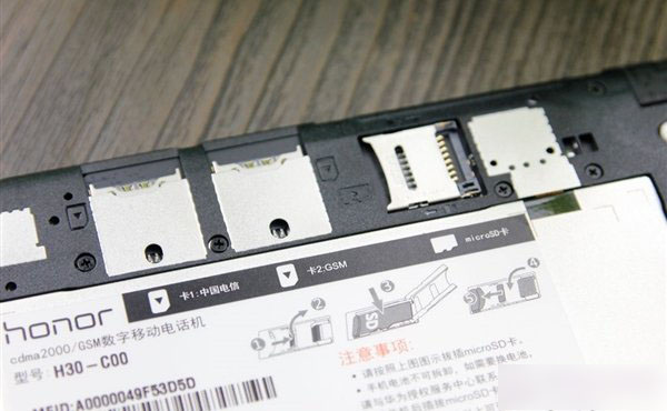 华为荣耀3C电信版依旧是可拆卸后盖的设计,但此次的电池变成了内置不可更换的设计,电池容量为2000毫安时。电池仓的左侧是双micro SIM卡槽,网络方面支持CDMA2000+GSM,而micro SD卡最高支持32GB的拓展存储