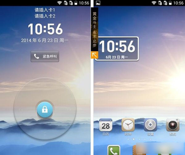 在系统方面,华为荣耀3C电信版采用了Emotion UI 2.0 lite,它是Emotion UI 2.0的简化版本,保留了Emotion UI 2.0中的常用功能,从而实现了去除冗余系统占用的目的。它的解锁界面和UI设计类似于旧版的Emotion UI,环形解锁可实现电话本、短信、拍照的快捷方式,同时继续取消了二级菜单。