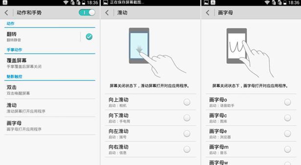 智能体感方面华为荣耀3C电信版支持的功能还是很丰富的,不仅有常见的翻转静音、双击环形屏幕和盖屏关闭,在黑屏状态下向不同方面滑动屏幕也可以直接进入特定的应用,画字母同样如此。