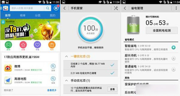华为荣耀3C电信版内置了一些华为自家的应用,应用市场内置了海量的各门类应用,同时也会不定时提示用户手机中已安装程序的更新。手机管家的功能比较丰富,手机加速、空间清理让用户的手机不再经常卡顿,省电管理中内置了三种省电模式:智能省电、超长待机和普通省电,用户可以针对实际状况进行选择