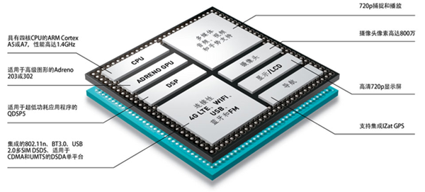 骁龙MSM8612是骁龙200系列最新版本,采用了全新的28纳米制程工艺,内置四核ARM Cortex A7 CPU,主频最高为1.2GHz,支持LP-DDR2内存,显示核心采用Adreno 302 GPU,屏幕分辨率最高支持1280*800,摄像头像素最高支持800万。