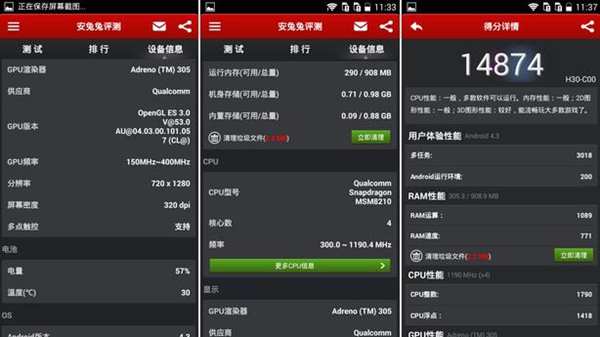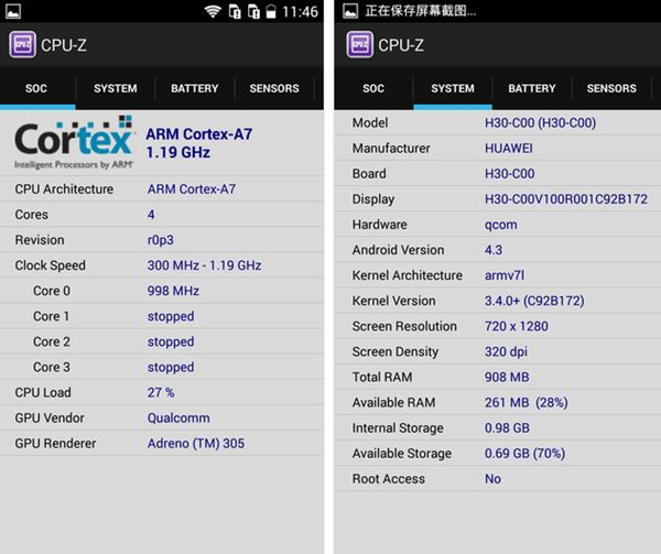 性能方面,华为荣耀3C电信版内置的是归属于骁龙200系列的1.2GHz主频骁龙MSM8612四核处理器,内置1GB RAM+4GB ROM(首次开机实测用户可用空间约为1.8GB)。