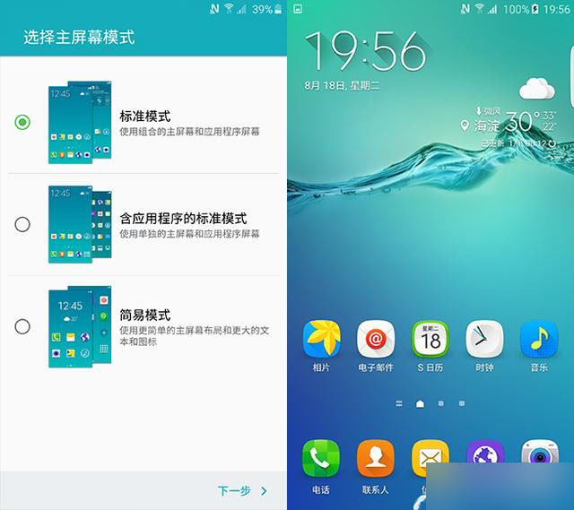 不过在edge+上,此次的Touchwiz做出了一些调整,主要是界面上的。最明显的调整在于开机后的三种界面选择,三星在edge+上增加了不含应用程序菜单的标准模式,其实就是把所有的程序图标都放在桌面上了,没有了程序屏,用过国产手机的都明白。