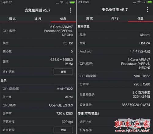 联发科使用了四核A7处理器,虽然并不先进,但你也许发现了,安兔兔检测是五核心手机,实际上亮点正在这里,还有一颗省点内核,可以有效保证续航。另外,图形核心使用了双核MaliT628,支持OpenGL ES3.0, OpenCL1.1, OpenVG1.1,也比红米2更胜一筹。