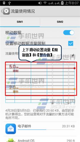 2)勾选【设置移动数据流量限制】,根据需求上下滑动设置流量【限制值】和【警告值】。(如下图)