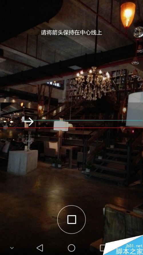 6、松开快门后,屏幕上会提示”请将箭头保持在中心线上“,此时只需要按箭头的指示的方向移动手机,并确保箭头在中心线上。