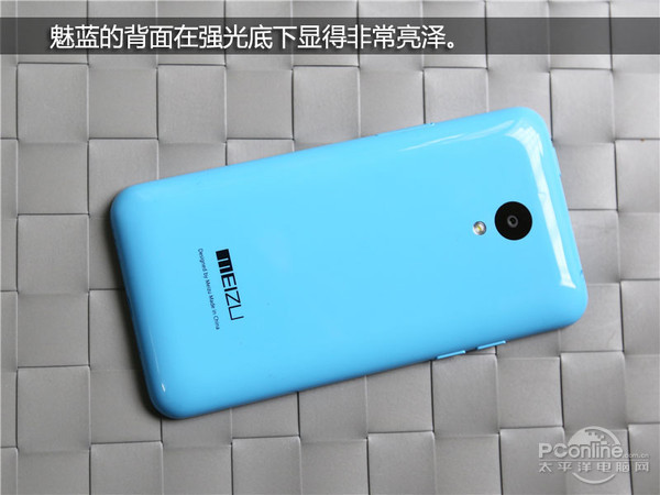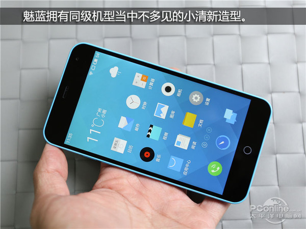 魅蓝YunOS版的外观也与普通版保持一致,本次参与评测的产品为主打的蓝色型号,尽管大众对这种类似于苹果iPhone 5C的风格褒贬不一,但这样在同级国产机型当中不多见的大胆色彩搭配方案还是让人眼前一亮的,让其充满年轻活力的气息,降低大家的审美疲劳感。