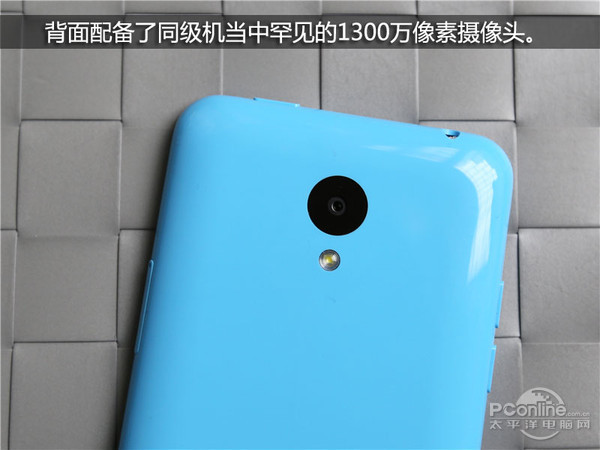 魅蓝YunOS版的背面材质为聚碳酸酯,采用一体成型工艺制作,表面非常光滑,给人富有质感的感觉,同时其也有一定的弧度,配合圆润的边角处理,握持时贴合手型,符合人体工程学。