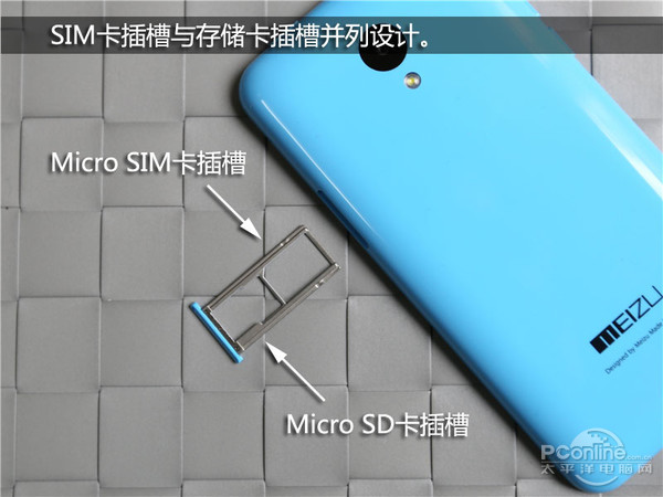 从魅蓝YunOS版机身的侧面可以抽出SIM卡与存储卡插槽,它们采用并列式设计,左边的支持放入Micro SD卡,最高支持128GB扩展,而右边的支持放入Micro SIM卡,可以使用TD-LTE/TD-SCDMA/GSM网络制式,遗憾的是不支持双卡双待功能。