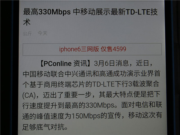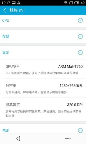 魅蓝YunOS版的屏幕尺寸为5.0英寸,分辨率为1280x768,PPI约为299,接近视网膜屏幕300PPI的标准。在近距离查看屏幕时,文字边缘有一定的锯齿感,而在正常距离下观看时还是比较细腻的。