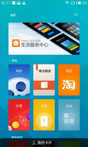 在主界面最左边位置,设有生活服务中心,其整合了YunOS特色的卡片式服务界面,这些服务与云端深度结合,在上面我们可以逛淘宝、看小说、查快递与看新闻等等,覆盖了生活当中使用频率较高的服务,减少不必要的应用软件占用手机内部的资源。