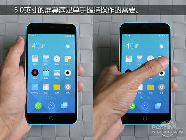 即使在屏幕尺寸更大的机型MX4(5.36英寸)上面,魅族也强调在设计上面考虑了握持的手感,而在5.0英寸的魅蓝YunOS版当中,自然延续了前辈机型在握感上面的优秀体验。魅族把5.0英寸的屏幕放在4.7英寸大小的手机上面,单手操作显得更轻松。