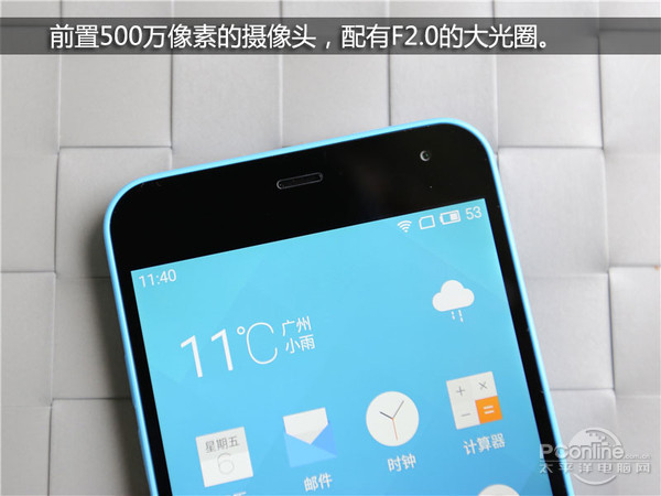 机身顶部设有500万像素的摄像头,采用了OV公司的5670传感器,拥有F2.0的大光圈保障通光量,支持FotoNation智能美颜功能。摄像头旁边的光线感应器与距离感应器采用隐藏式设计,前者能有利于将屏幕亮度控制在合理范围,后者可在用户脸部贴近通话时关闭屏幕,达到节约电能与防止误触的效果。
