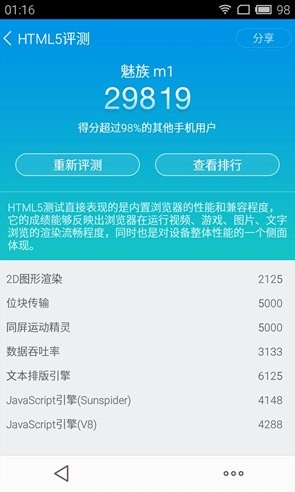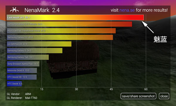 在NenaMark1测试当中,魅蓝YunOS版的成绩为58.8fps,而在NenaMark 2.4当中的成绩为59.1fps,表现还是不错的,说明应对一般的3D应用,魅蓝YunOS版可以流畅运行。