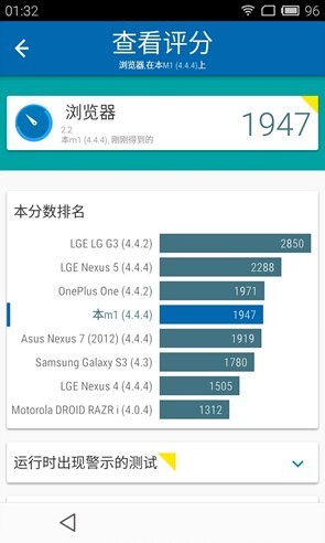 从综合性能跑分软件当中我们可以看到,魅蓝YunOS版性能表现处于入门级机型的阶段,与中高端机型还存在差距,但对于大众用户来讲性能还是卓卓有余的。