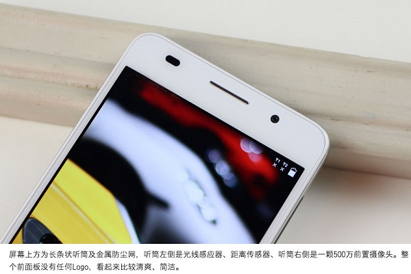 荣耀6屏幕上方从左至右分别光线/距离传感器、听筒以及前置摄像头等。其前置了500万像素摄像头,支持声控拍照、笑脸抓拍、10级美颜等,自拍上也会有不错表现。