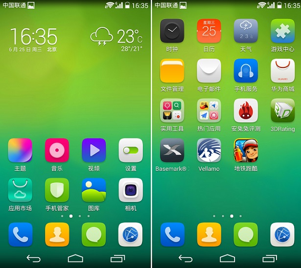 系统界面方面,Emotion UI 2.3采用的是拟物化风格界面设计,与时下流行的iOS扁平化风格有所不同,不过精细的图标设计,也使得华为荣耀6系统界面比较美观,下图为荣耀6主体系统界面。