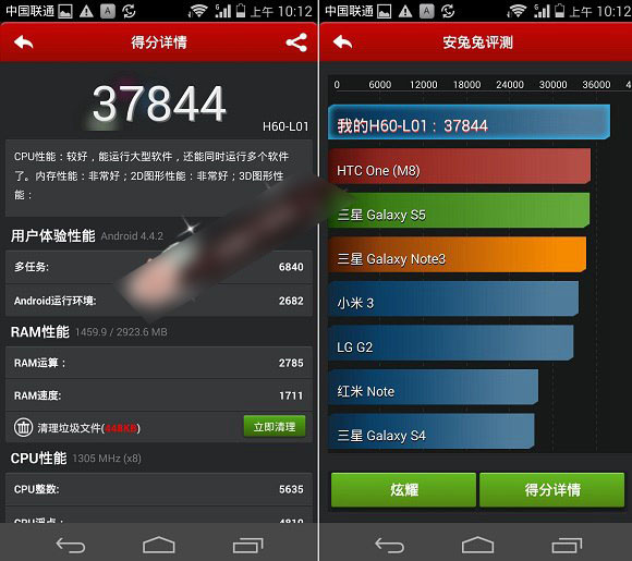 荣耀6搭载了1.7Ghz海思麒麟920八核处理器,运行3GB大内存,通过安兔兔跑分软件测试,其得分达到了37494高分,安兔兔跑性能跑分第一,性能上已经可以媲美最知名的高通801四核处理器,如下图所示: