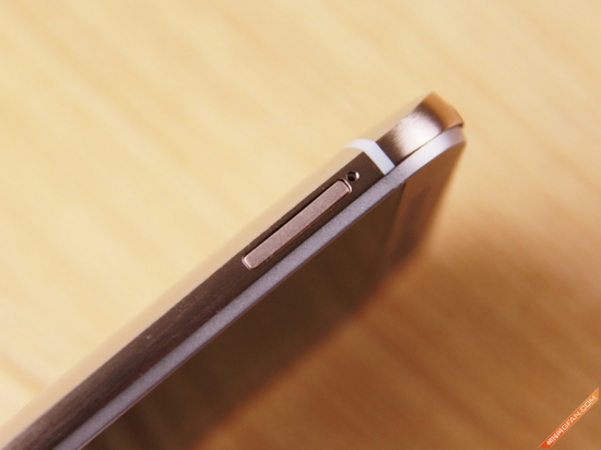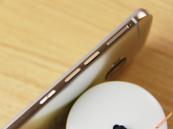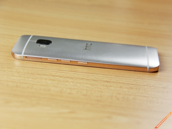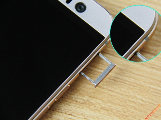 M9的中框部分采用的才是真正的金色,由于右侧三颗按键的大小形状十分相似,所以M9在电源键处采用了凹凸纹路设计,便于区分。不过问题来了,不知道你看到这些按键+卡槽,会不会感到有些凌乱呢?