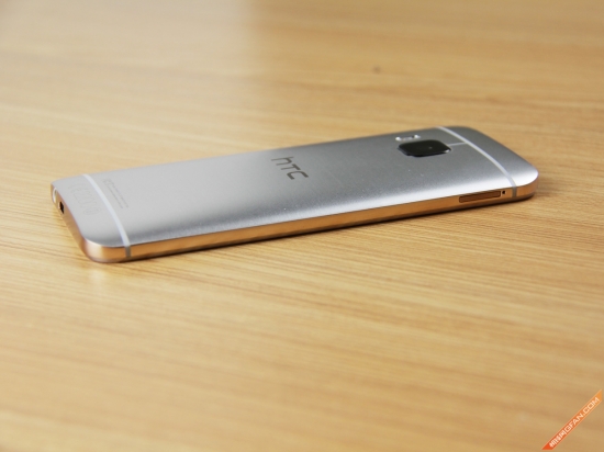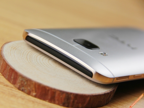 这款金银汇配色的M9,并不完全是金色与银色之间的金属搭配,在中框部分还多出一个颜色。从图中可以看出,正面板上的金色有些向银色靠拢,是一种介于金与银之间的颜色。