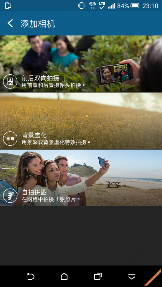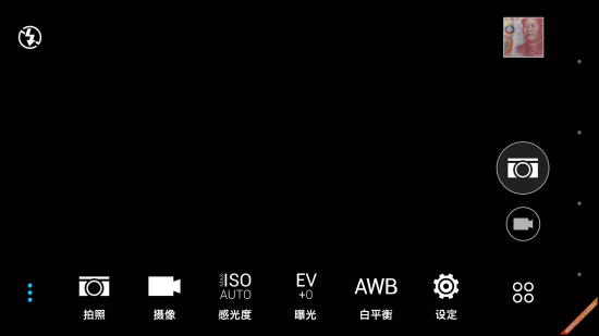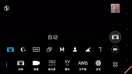 HTC M9的相机主界面猛一看好像挺复杂,其实在普通的自动拍照模式用不到这些东西,只有调整到手动模式中才会用到,此外,M9的相机界面没有那么多需要滑动操作的地方,大部分还是需要点击图标的,只有在主界面以及选择拍照模式界面才会用到滑动操作。