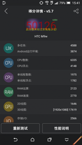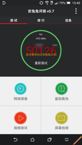 小结:通过安兔兔得分来看,M9的得分已经超过了50000分,那么50000分意味着什么呢?实际上,安兔兔得分超过40000分的产品已经可以被列为旗舰级别产品,所以M9的性能应该不用我们担心了,玩大型游戏,看高清电影都没有什么问题。