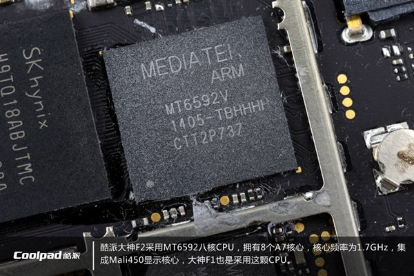 酷派大神F2采用联发科MT6592八核CPU,拥有8个A7核心,核心频率为1.7Ghz,内置Mali450核心显示,搭载的CPU与大神F1相同,性能定期中高端。