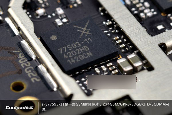打开主板背面芯片上的屏蔽罩后,就可以看到酷派大神F2核心控制芯片了,包括CPU、内存、手机的基带芯片等部分,如下图所示: