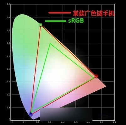 广色域手机在绿色部分的色域范围远大于常规sRGB