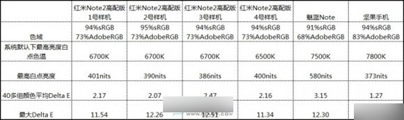 从参数上看,虽然红米Note 2高配版使用的是天马屏幕,但是在色域、色温、色彩偏离度方面都不差,在色彩偏离度上对比魅蓝Note的夏普/友达屏幕有较大优势,而在色温方面默认色温也更接近于6500K,sRGB色域的覆盖也要好于魅蓝Note,魅蓝Note的最高亮度倒是远超红米Note2以及坚果手机。