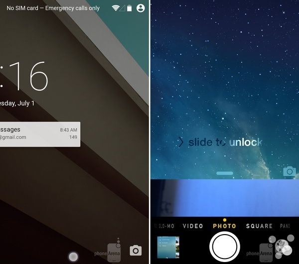 另外有些用户可能喜欢iOS系统中,在收到锁屏通知时会发亮几秒钟,方便用户及时阅读,但是在Android L中就没有这个特性。两个系统的锁屏还有一个区别,Android L锁屏上有电话应用的快捷键,但是iOS系统没有,两个系统锁屏均有相机快捷键。
